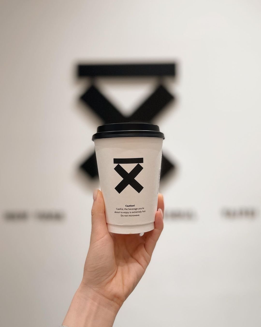 Hand holding a white coffee cup with black logo and text, blurry abstract wall art in background.